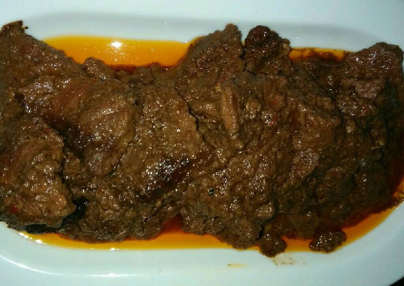 - Masukkan santan, bumbu, daging,masak sampai setengah kering, masukkan garam, gula sedikit cicip rasa, lalu masukkan kelapa sangrai halus